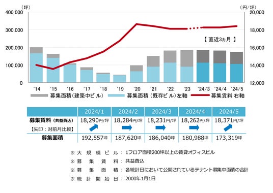募集賃料は前月比プラス109円/坪の18,371円/坪となった。前月から小幅に上昇したものの、募集賃料は18,000円/坪台前半での横ばい傾向が継続している。<募集賃料&募集面積>