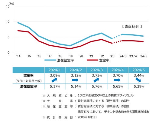 幅広い業種で拡張移転やビルグレード改善といった前向きな移転需要の割合が高い状態が継続している。<空室率&潜在空室率>