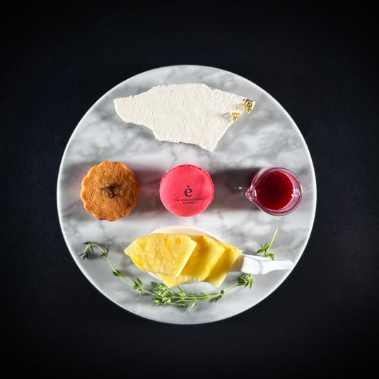 パフェの構成は、マカロン(5種)・フルーツ(7種)・ハーブ&フラワー(6種)・チャーム(4種)