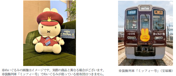 阪急電鉄では、現在「ミッフィー」とのコラボレーション企画を実施しており、大変ご好評いただいております。その一環として、神戸線・宝塚線・京都線で運行している装飾列車「ミッフィー号」では、乗務員室に制服を着た「ミッフィーぬいぐるみ」が添乗しており、その可愛らしい姿が話題となっています。