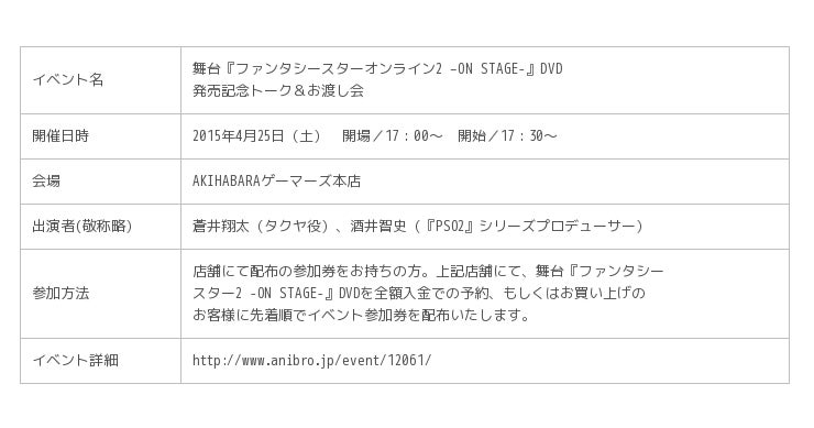 株式会社セガは、2015年3月26日発売予定、舞台『ファンタシースターオンライン2 -ON STAGE-』公演DVD作品におきまして、本商品の発売を記念してDVDをご購入いただいたお客様を対象に、2015年4月25日(土)「AKIHABARAゲーマーズ本店」(東京・秋葉原)にて発売記念イベントを開催いたします。
