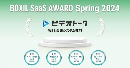 「ビデオトーク」は、「BOXIL SaaS」WEB会議システム部門で投稿された「口コミによるサービス評価」9項目において、各カテゴリ・項目において一定の基準を満たした上で、最も高い平均点を獲得したサービスとして『サービスの安定性No.1』『機能満足度No.1』『カスタマイズ性No.1』『使いやすさNo.1』を受賞しました。