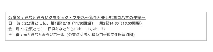 本シリーズは第1部12:10、第2部14:30で各部50分ずつの1日2部形式別プログラム。どちらか1部だけでもいいし、時間が許せば両方の部を通して聴くと演奏者のこだわりや音楽の深さがよりわかる構成になっています。本シリーズのユニークな点がもう一つ。1部と2部の間が90分(13:00~14:30)となっており、お食事や、みなとみらいの街散策を取り入れることで、“名手が奏でる音楽”と“平日午後のヨコハマ”の両方を満喫できるというもの。音楽と“みなとみらいの街”を楽しんでいただく、横浜みなとみらいホールならではの魅力あるシリーズ公演です。