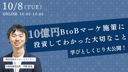 審査制・決裁者マッチングプラットフォーム「ONLY STORY」「チラCEO」(サービスサイト:https://onlystory.co.jp/ )を運営する株式会社オンリーストーリー(代表取締役:平野哲也、本社:東京都渋谷区)は、2024年10月08日(火)12:00-13:00 に自社主催ウェビナー「10億円 BtoBマーケ施策に投資してわかった大切なこと~学びとしくじり大公開~」を開催いたします。