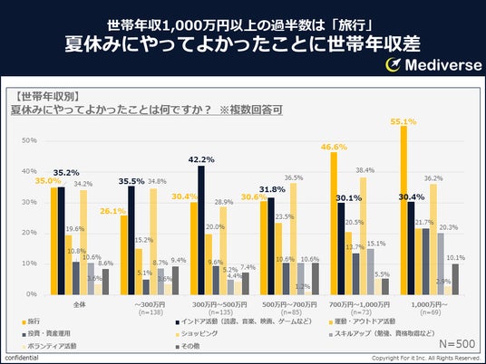 今回のアンケート調査結果では、今年の夏休みにやってよかったこととして、「旅行」「インドア活動(読書、音楽、映画、ゲームなど)」と屋内外いずれの活動もランクインしており、各活動への投票率は、性別・年代・世帯年収がいずれも大きく影響していることが判明いたしました。