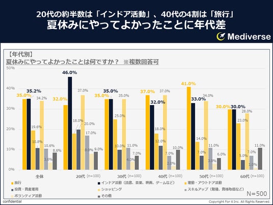 年代別に見ると、今年の夏休みにやってよかったこと上位は年代ごとに異なっていた。