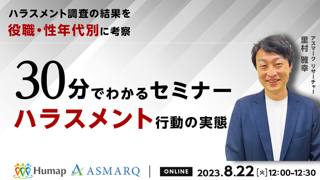従業員総活躍サービス「Humap」を提供する株式会社アスマーク(東京都渋谷区東、代表取締役:町田正一)は、2023年8月22日(火)12:00に「ハラスメントの実態」調査結果を用いて、アスマーク現役リサーチャーによるデータ解説セミナーを開催いたします。