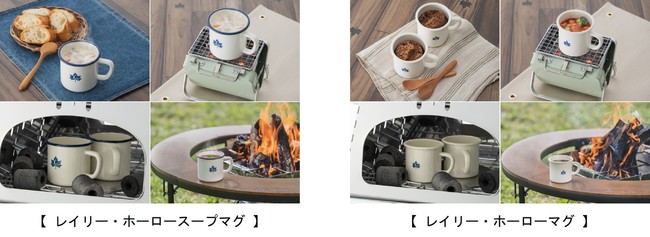 スープなどを飲む際にぴったりな容量550mlの「レイリー・ホーロースープマグ」と、ミニテーブルに置きやすくカップケーキなどを作るのにぴったりな容量400mlの「レイリー・ホーローマグ」の2サイズのマグカップを展開。別売りの「LOGOS THE KAMADO」でも調理可能。