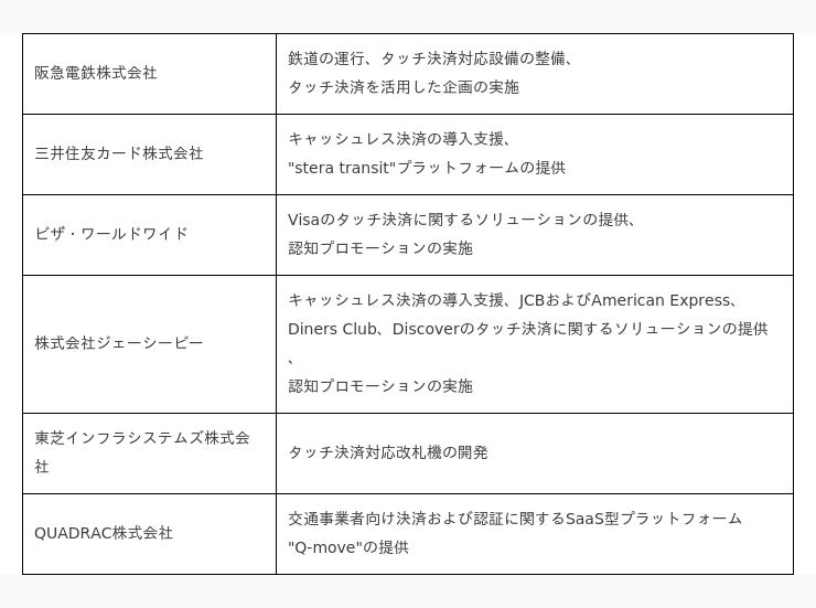 阪急電鉄株式会社(本社:大阪市北区、代表取締役社長:嶋田 泰夫)、三井住友カード株式会社(本社:東京都江東区、代表取締役社長:大西 幸彦)、ビザ・ワールドワイド・ジャパン株式会社(本社:東京都千代田区、代表取締役社長:シータン・キトニー)、株式会社ジェーシービー(本社: 東京都港区、代表取締役兼執行役員社長:二重 孝好)、東芝インフラシステムズ株式会社(本社:川崎市幸区、代表取締役社長:今野 貴之)、QUADRAC株式会社(本社:東京都港区、代表 取締役社長:高田 昌幸)は、2024年内に、阪急電鉄の全駅で三井住友カードが提供する公共交通機関向けソリューション「stera(ステラ) transit(トランジット)」を活用したタッチ決済対応のカード(クレジット・デビット・プリペイド)や、カードが設定されたスマートフォンなどによる鉄道乗車サービスを開始します。