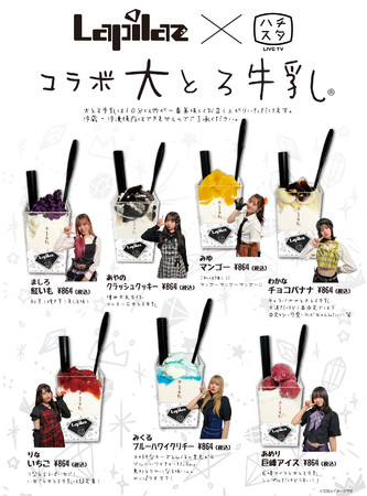 『Lapilaz』7名それぞれが、メンバーカラーをテーマにした『大とろ牛乳』をプロデュースしました。オーソドックスなトッピングからブルーハワイとクリームチーズを組み合わせた絶妙なトッピングまで、個性溢れる『大とろ牛乳』 を、全7種類ご用意しております。