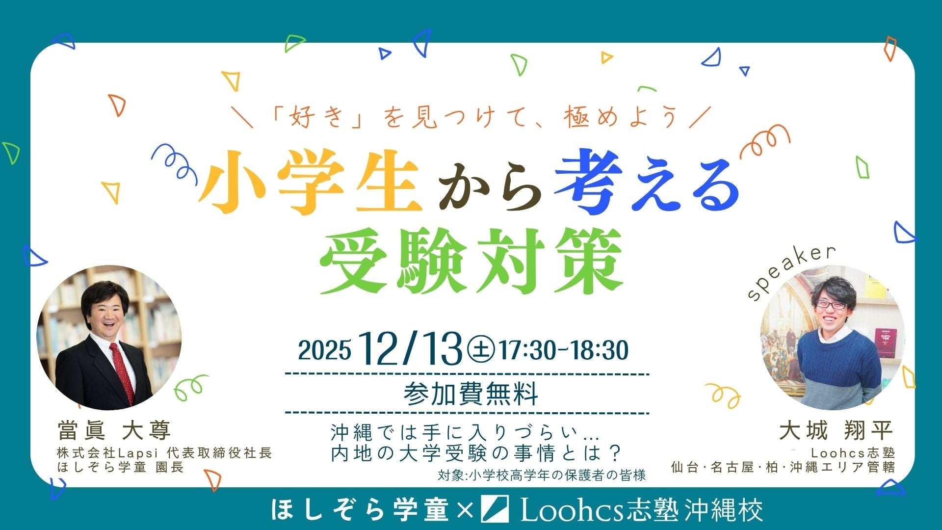 今回のイベントでは、沖縄で教育に携わる二人の登壇者が、地域の教育現場と受験指導の両側面から、子どもたちの“好き”を伸ばすための具体的な視点とアプローチを語ります。
