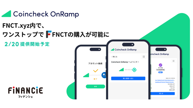 株式会社フィナンシェ(本社 東京都渋谷区 代表取締役 國光 宏尚、以下、フィナンシェ)は、コインチェック株式会社(本社:東京都渋谷区、代表取締役:蓮尾 聡、以下、コインチェック)が提供開始する暗号資産購入・送金サービス「Coincheck OnRamp(コインチェック・オンランプ)」の導入を決定しましたことをお知らせいたします。これにより、2024年2月20日(火)(※1)より、暗号資産FNCT(フィナンシェトークン)のメインページである「FNCT.xyz」内で完結する形で、FNCTを購入できるようになります。