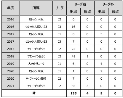 J1リーグ 7試合(0得点) / J2リーグ 105試合(4得点)