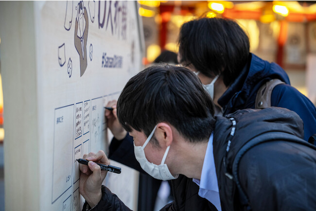 来場したビジネスパーソンは、巨大なDX祈願絵馬に2023年に叶えたい「DXにまつわる願いごと」を記入し願掛けをしたほか、来年のDX推進を祈願する「DXご祈祷」に参加しました。また、2015年から年末恒例で実施している「名刺納め」も行われ、8000枚を超える名刺がお納めされました。なお、本イベントは12月21日(水)まで開催されています。
