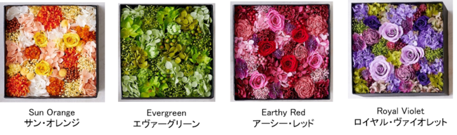 フラワーボックスは、オレンジ、グリーン、レッド、ヴァイオレットをベースにした4色展開でご用意。