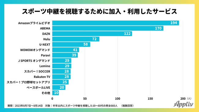 ナイル株式会社(本社:東京都品川区、 代表取締役社長:高橋飛翔、 以下ナイル)が運営するスマートフォンユーザー向けアプリ情報メディア「Appliv(アプリヴ)」にて、10代~60代の男女660人を対象に、2023年8月7日~8月14日の期間で、スポーツ中継と動画サービスの利用状況に関するアンケート調査を実施しました。