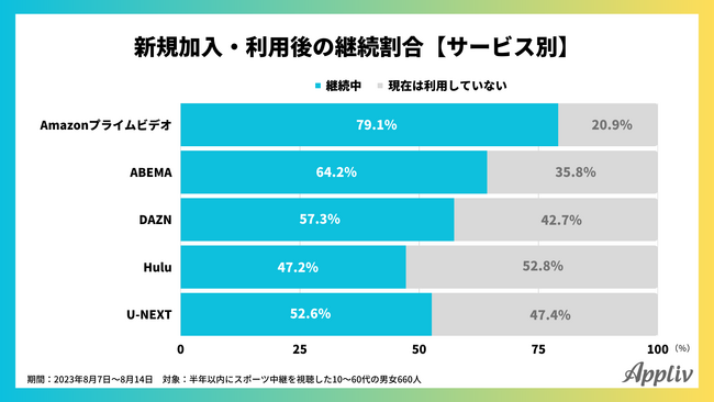 継続率が最も高かったのは「Amazonプライムビデオ(79.1%)」、続いて「ABEMA(62.4%)」、「DAZN(54.9%)」となっています。