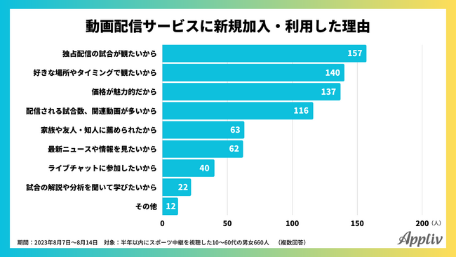 自分の観たい試合が、特定の動画配信サービスでしか観られないことを理由に、新規加入・利用した人が多いようです。