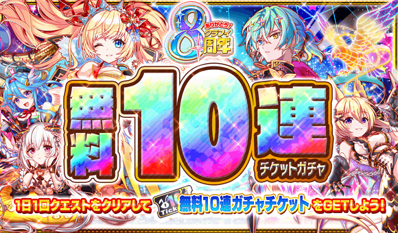 8周年イベントでは、無料10連チケットガチャやログインボーナスを始めとした、「8大キャンペーン」を実施!
