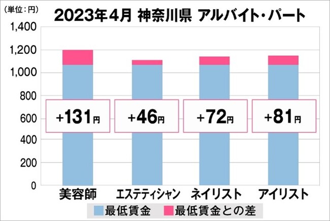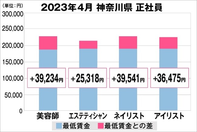 2023年4月時点で『美プロ』に掲載されている「神奈川県」の「美容師・エステティシャン・ネイリスト・アイリスト」求人における「正社員」「アルバイト・パート」の給料を抽出。