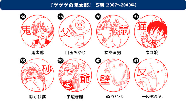 幽霊族最後の生き残りである主人公の鬼太郎はもちろん、鬼太郎の父親で茶碗風呂によく入っている目玉おやじのほか、ねずみ男、ねこ娘、砂かけばばあ、子泣きじじい、一反もめん、ぬりかべの8キャラクター(第1期~第6期の各6種類ずつ)と、アニメに登場した天童ユメコ(第3期)・犬山まな(第6期)の2名をくわえた合計50種類。