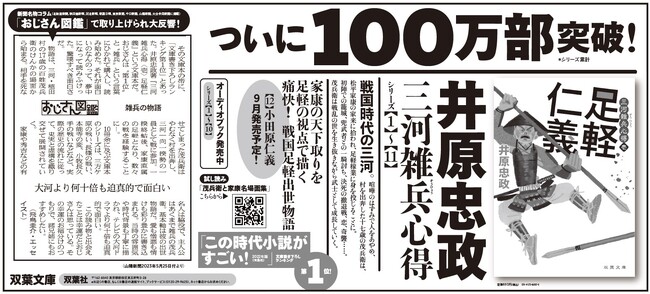 井原忠政氏の人気歴史時代小説「三河雑兵心得」(双葉文庫)が7月にシリーズ累計100万部を突破しました。2020年2月に発売の第1巻『三河雑兵心得 1 足軽仁義』から順調に巻を重ね、約3年5カ月での達成となります。