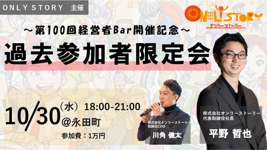 審査制・決裁者マッチングプラットフォーム「ONLY STORY」「チラCEO」(サービスサイト:https://onlystory.co.jp/ )を運営する株式会社オンリーストーリー(代表取締役:平野哲也、本社:東京都渋谷区)では、自社主催「経営者BARイベント」の100回開催を記念し、特別回を開催することを決定いたしました。本イベントは100回開催までの間の過去参加者の方々と対象としたイベントとして、10月30日 (水曜日)18:00~21:00に実施いたします。