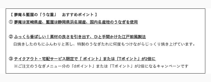 2.【テイクアウト・宅配限定】対象のうなぎメニューのご注文で「dポイント」or「Tポイント」が2倍に!