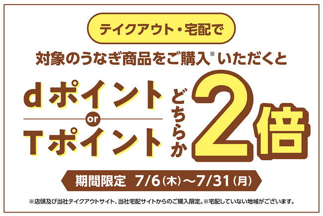 事前エントリー不要、期間中のテイクアウト・宅配ご利用(※)で、ご注文のうなぎメニュー分の「dポイント」または「Tポイント」が2倍になるキャンペーンです。