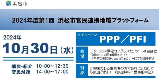 浜松市では公共施設の整備・運営等において、公共サービスの質の向上や効率化を実現するため、官民連携を推進してまいりました。今後のPPP/PFI事業において、官民連携による市民サービスの向上や、にぎわい創出、収益確保等を促進していくため、この度、PPP/PFIをメインテーマとし、2024年度第1回浜松市官民連携地域プラットフォームを開催します。