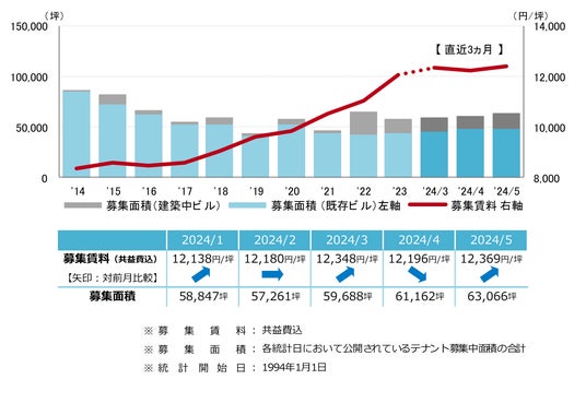 募集賃料は前月比プラス173円/坪の12,369円/坪となった。募集賃料は再び上昇し、統計開始以来の最高値を更新している。<募集賃料&募集面積>
