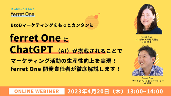 『ChatGPT』を活用したBtoBマーケティング活動における生産性向上テーマに興味があるマーケティング担当者を対象に、『ferret One』のマーケティングマネージャーを務める林と、プロダクト開発責任者を務める小松が、「『ChatGPT』を用いることで世の中的に起こった生産性向上事例」「『ferret One』×『AI』によるマーケティング業務の変化」「『ferret One』における“コンテンツ作成支援機能”の概要」について解説いたします。・セミナーページURL:https://ferret-one.com/seminar/chatgpt・開催日時:4/20(木)13:00~14:00・申込・視聴方法:Zoom