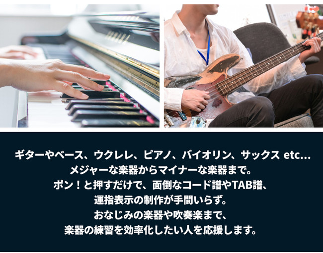 楽譜に書き込むことが面倒なコード譜やTAB譜、運指図がポン!と押すだけで印字され、指で押さえる箇所を⿊く塗りつぶすだけで完成させることができます。