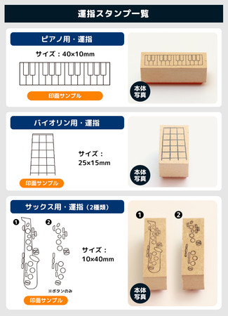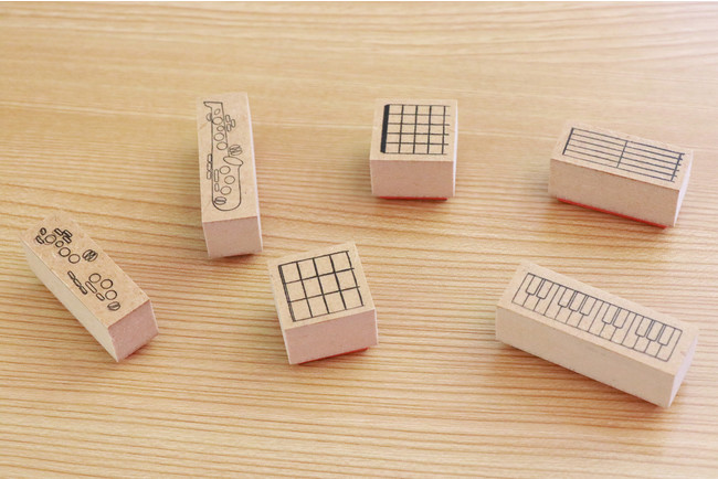 ミュージシャンのお客様からいただいた声から企画した、楽器練習時のめんどうな作業を効率化するためのはんこ。ギター、ウクレレ、ベース、ピアノ、バイオリン、サックスの7種類をそろえました。