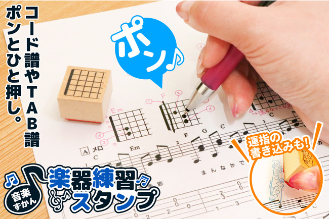 ポン!と押すだけで、楽器の練習時にめんどうな、コード譜やTAB譜、運指図を書き込む手間を省き、効率よく楽器が練習できるミュージシャンのためのはんこ「音楽ずかん 楽器練習スタンプ」。