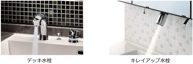 また、「タッチレス水栓 ナビッシュ」は、手が汚れていても手を差し出すだけで自動で水が出るので、水栓はきれいなままです。自動吐水と手動吐水の切替操作不要で、どちらでも快適に湯水が使えます。カウンター部に設置し存在感のあるデザインでボウルの周りのアクセントになるデッキ水栓と、上から水がでるので水栓のまわりに水がたまりにくく、拭き掃除の手間がほとんどないキレイアップ水栓の2タイプからお選びいただけます。