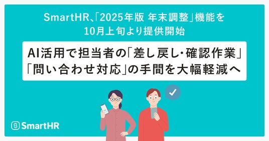 クラウド人事労務ソフト「SmartHR」を運営する株式会社SmartHR(本社:東京都港区、代表取締役CEO:芹澤 雅人)は、2025年の税制改正に対応する「2025年版 年末調整」機能を10月上旬から提供開始します。