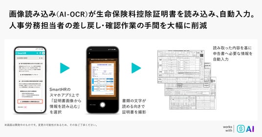 従業員が生命保険料控除証明書を撮影し、スマートフォンアプリにアップロードするだけで、保険会社名や保険料などの情報が自動入力される画像読み込み(AI-OCR)※2を新たに提供します。従業員による手入力を減らすことで、記入漏れやミスを防ぎ、差し戻しの手間を大幅に軽減します。