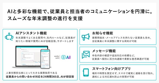 税制改正にともない年末調整の複雑化が懸念される中、新たに搭載する生命保険料控除証明書の画像読み込み(AI-OCR)と、従業員からの問い合わせに24時間365日対応する「AIアシスタント」機能をあわせて活用いただくことで、年末調整における人事労務担当者にとって特に負荷の高い「差し戻し・確認作業」「問い合わせ対応」の業務効率化を実現します。