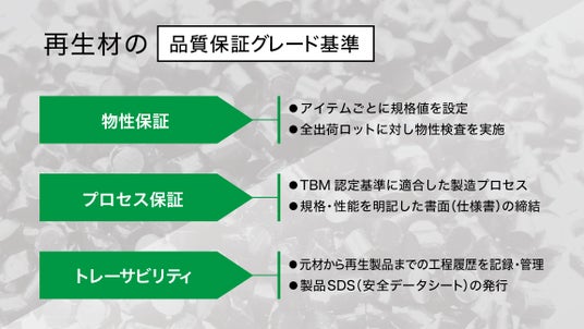株式会社TBM(本社:東京都千代田区、代表取締役CEO:山崎敦義、以下TBM)は、トレーサビリティ情報等を付与した再生材や再生原料(以下、再生材等)の調達を支援するプラットフォーム「Maar 再生材調達」(以下、本サービス)を提供しています。このたび、本サービスを通して、TBMが「物性」・「プロセス」・「トレーサビリティ」を保証した再生材を「プレミアム再生材 品質保証グレード」として販売し、本グレードを製造する再生材メーカー(以下、リサイクラー)を、TBMの認定リサイクラーとして選定する制度を開始します。