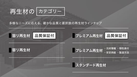 TBMが「物性」「プロセス」「トレーサビリティ」を保証した「プレミアム再生材 品質保証グレード」を利用することで、品質のバラつきが懸念されやすい再生材を安心して採用できます。また、今後TBM認定リサイクラーが拡大することで必要な量を安定的に調達することが可能になります。