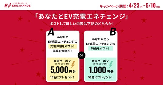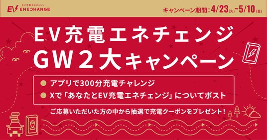 ENECHANGE(エネチェンジ)株式会社(本社:東京都中央区 代表取締役CEO:城口洋平)は、EVユーザーのお出かけを支援する「EV充電エネチェンジGW2大キャンペーン」を2024年4月23日(火)から5月10日(金)まで開催いたします。アプリでの充電利用、またはX(SNS)にポストいただくと、充電クーポンをプレゼントいたします。