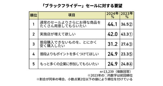 「ブラックフライデーセールに対する要望」も聞いてみたところ、「通常のセールよりさらにお得な商品をたくさん用意してもらいたい」(44.1%)が最も多い結果でした。昨年も同様の質問をしていますが、36.5%(2位)から大幅アップしています。
