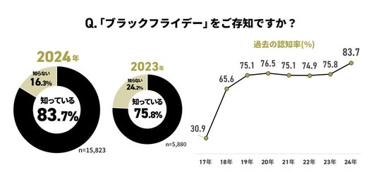 まず、「ブラックフライデー」を知っているかどうかの質問に対して、83.7%の人が「知っている」と答えています。昨年(75.8%)から7.9ポイントアップしました。なお、当社が2017年より毎年調査している中で初めて認知度が8割を超えました。