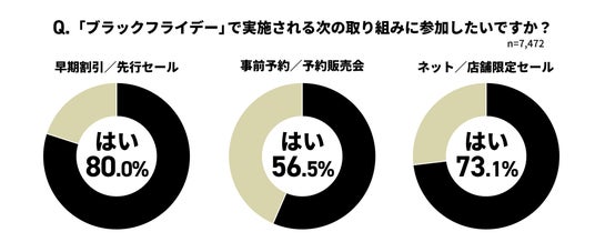 本場アメリカの「ブラックフライデー」は、感謝祭(11月の第4木曜日)の翌日の金曜日、今年は11月29日になりますが、日本では11月23日の勤労感謝の日前後に実施されることが多いようです。さらに最近では11月初旬から先行セールや事前予約、限定セールなどを実施する企業も増えてきました。そこで、各取り組みに参加したいか聞いたところ、ブラックフライデーの時期より前にセールを実施する「早期割引/先行セール」が80.0%、ブラックフライデーの時期より前に予約した人のみがお得に購入できる「事前予約/予約販売会」が56.5%、ネットもしくは店舗でのみセールを実施する「ネット限定/店舗限定セール」が73.1%といずれも高い意向を示しています。「ネット等で事前に申し込みや抽選が出来るものは参加しやすい」(30代女性)という声がある一方で、「実際に店舗へ行って自分の目で確かめたい」(50代女性)という声もありました。