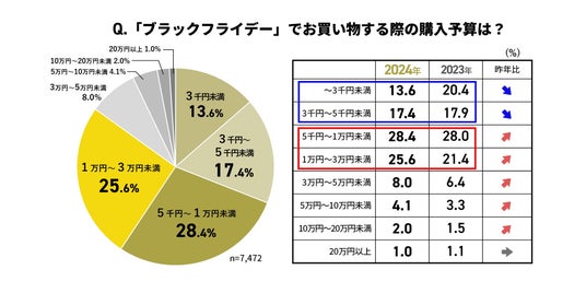 今年のブラックフライデーの購入予算を聞いてみました。「5千円~1万円未満」が28.4%と最も高く、次いで「1万円~3万円未満」が25.6%でした。昨年2023年と比較すると、「3千円未満」(13.6%)、「3千円~5千円未満」(17.4%)の割合がそれぞれ減少する一方、1万円以上(1万円~20万円未満)の割合が全体的に増えていることから、今年の購入予算は増加傾向にあることが伺えます。物価高の影響を受けつつも、購買意欲が向上している様子が見て取れます。