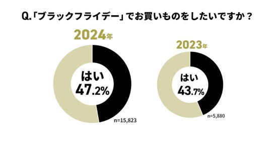 今年のブラックフライデーに買い物をしたいか意向を聞いたところ、およそ5割近く(47.2%)の人が「買い物をしたい」と答えています。こちらも昨年から3.5ポイントアップしています。前年と比較して確実に増加傾向にあることがわかります。