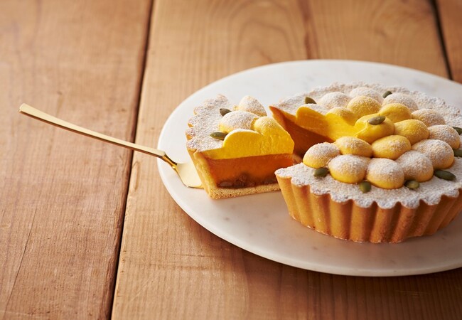 タルト台は、バターが香るさくさくのサブレ生地。素材の甘さを生かした濃厚なかぼちゃ生地を、高さのあるタルト台にたっぷりと流し込んで焼き上げ、ふわふわの軽やかなかぼちゃクリームを花形にデコレーション。