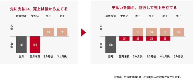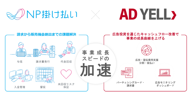 「請求から販売機会創出までの課題解決」と「広告投資を通じたキャッシュフロー改善で事業の成長曲線を上げるサポート」をワンストップで提供可能にいたします。具体的には、「NP掛け払い」のご利用企業が、さらなる事業成長を目指して広告投資をする際に、懸念となるキャッシュフロー圧迫を解消することを目的に、「AD YELL」を提供いたします。さらに、「AD YELL」のご利用企業が、請求関連業務の課題や取引先与信の不安を抱える際に、「NP掛け払い」の提供で支援いたします。また、両サービスの利用により、顧客企業からのキャッシュイン(売掛金の入金)を早め、先行投資として運転資金を圧迫しやすい広告投資のキャッシュアウト(支払いなどの出金で企業の現金が流出すること)のタイミングを延長できることで、ランウェイ(事業の運転が可能な期間)を延長(※5)することにも貢献し、事業を推進するために必要な本来の業務に集中できる環境づくりをサポートいたします。