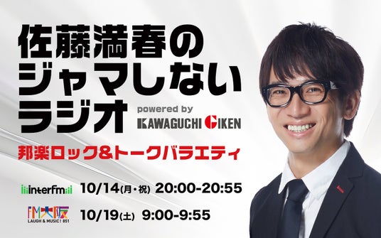 interfm(東京:89.7MHz 横浜:76.5 MHz)は、2024年10月14日月曜・祝日夜8時から(エフエム大阪10月19日土曜朝9時から)佐藤満春がDJを担当する特別番組 『佐藤満春のジャマしないラジオ powered by Kawaguchigiken』 の放送が決定しましたことをお知らせいたします。